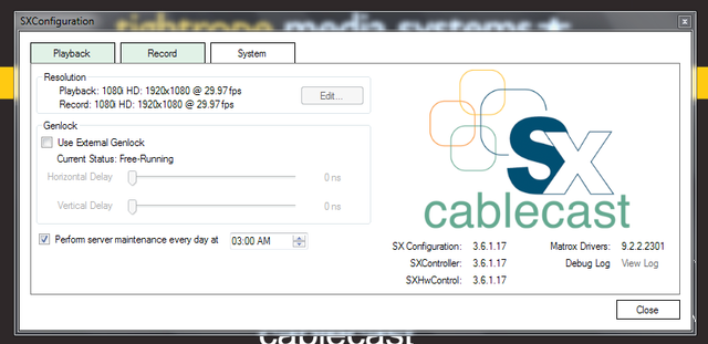 The SXConfiguration application is an application that runs on your SX server. It allows you to configure basic global settings for the server, and allows for playback and recording for testing purposes. The application starts automatically when Windows starts and is normally hidden.
