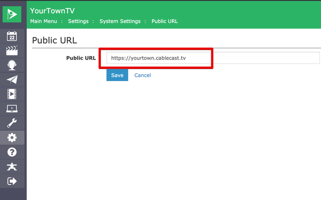 If your system is already configured for Cablecast VOD or Live Streaming you can find your public address in the systems' Public URL setting: