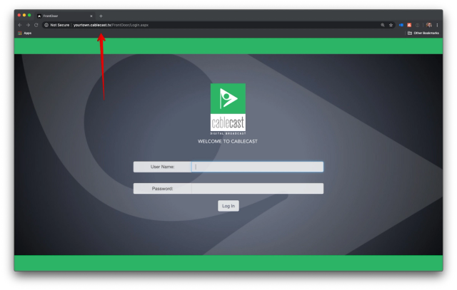 With port forwards in place and public address in hand it's as easy as typing the Public URL in your web browser and signing into Cablecast. Your cablecast system might be configured to redirect you to the Cablecast Public Site instead of the Frontdoor login. If that's the case enter /Frontdoor/Login.aspx to your Public URL to access the login screen. For instance if your Public URL was example.com you could access Frontdoor by visiting http://example.com/Frontdoor/Login.aspx