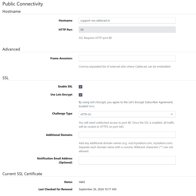 Once an external name address has been connected to the Public facing IP address for the host unit, simply log into the Cablecast UI and navigate to Settings>System Settings>Public Connectivity.