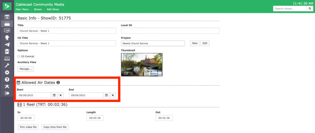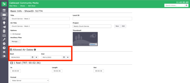 Now if we go into the show records for the programs that are part of that saved search, we'll set Allowed Air Dates for each program to tell the Autoschedule Rule to only schedule each of those shows during the specified dates. For example, we want our first service to start running on Sunday, 8/28/22, and stop running by the following Sunday when the next service will run.