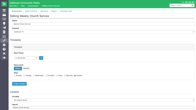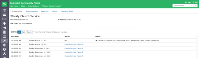 Say you have a weekly church service that runs and the producer has given you several weeks worth of services in advance. We have our Autoschedule Rule, as shown below, set to use the Top Search Result of our Saved Search for our Weekly Church Service and run that program at 11 am every Sunday.