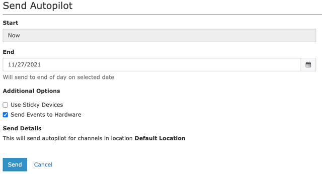 - End - Autopilot sends are always calculated from the start of the send to the specified end time. It is recommended to set this to roughly the amount of time the schedule will not be changed. For most stations, this will be three to four days. Ending an autopilot extremely far out, such as 10 or more days can cause long sends and is wasteful of system resources since it is very likely autopilot will be sent again before that run data needs to be calculated.