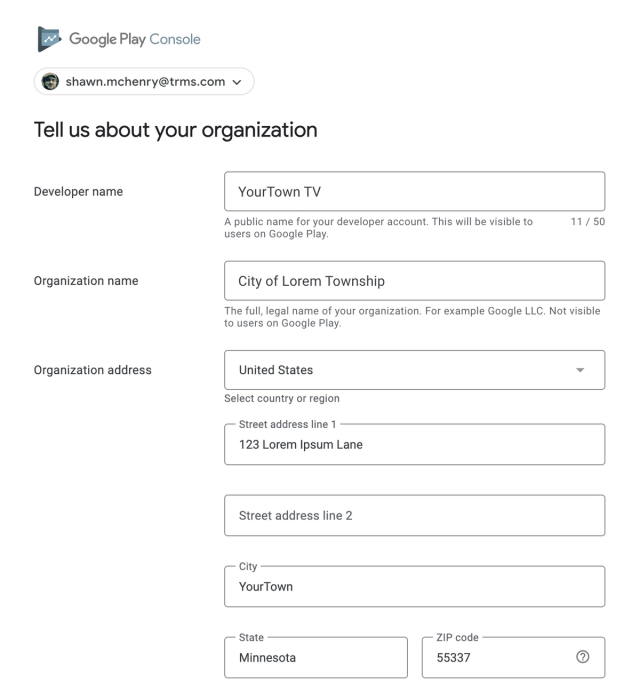 - Choose "An organization or business" for the developer account (unless otherwise specified)