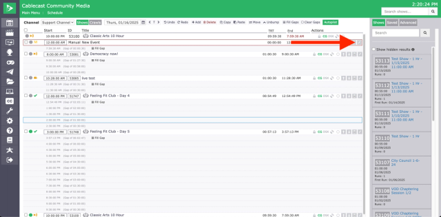 The Panel is broken down into tab groups for the different aspects of your Scheduled Event. Run Details: Choose your Show ID to play for manual events, set it's start time, will the event be locked (not able to be bumped from its start time) and will it be CG Exempt (unable to have crawls, bugs over the program video, and not reported in the schedule for a viewer). DSK Settings: The same settings you would find within a Show Record. Will there be a Text-bug, or a crawl specific to this program. Record Settings: Do you wish to record the program. Which device will it be recorded on (Destination), Where is the (Source) video coming from. How long should the recording run, when does the recording start. Caption Settings: If you're using Cablecast Cloud Services for captions or another 3rd party device for your captioning needs. https://support.cablecast.tv/s/articles/closed-captioning-with-cablecast-cloud-services Network Broadcast Settings: Stream the program to YouTube Live. https://support.cablecast.tv/s/articles/getting-started-with-social-streaming-in-cablecast-78 At the bottom of the page you'll also see Control Rooms, here you can assign a Control Room to the event. https://support.cablecast.tv/s/articles/getting-started-with-control-rooms-in-cablecast-78