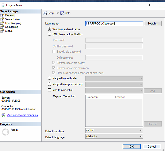You'll be greeted with a new user login window. For the login name add "IIS APPPOOL\Cablecast" (without quotes) to the login name field as seen in the picture below. Windows authenication should be selected by default.