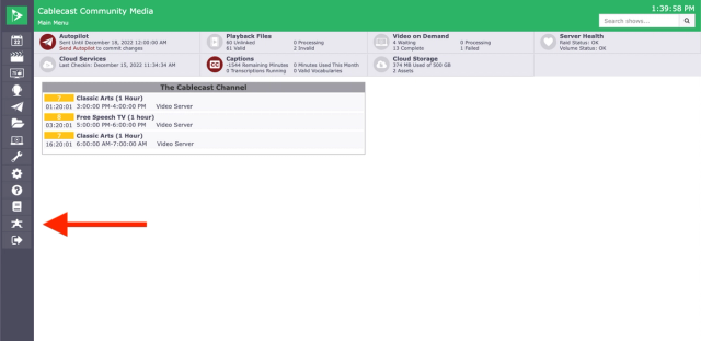 Open up the main menu of Frontdoor. If you are logged into Cablecast, click the Tightrope Icon to navigate to Frontdoor.