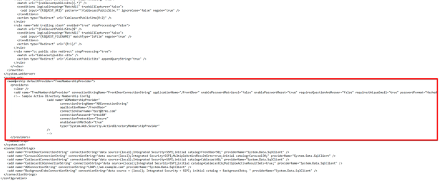 <add name="ADConnectionString" connectionString="LDAP://192.168.0.247" providerName="System.Data.SqlClient" />The connection string section will now look similar to this.