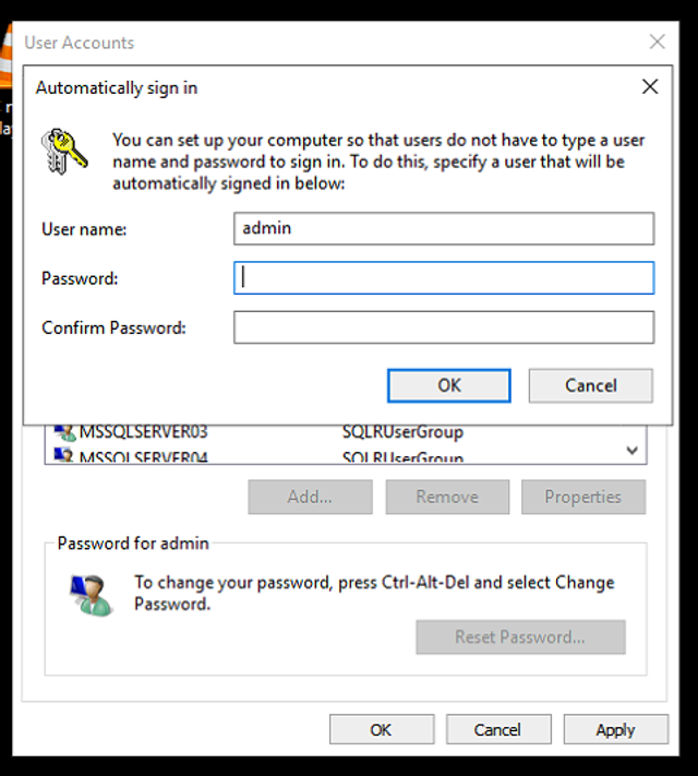 Configuring Windows for automatic login