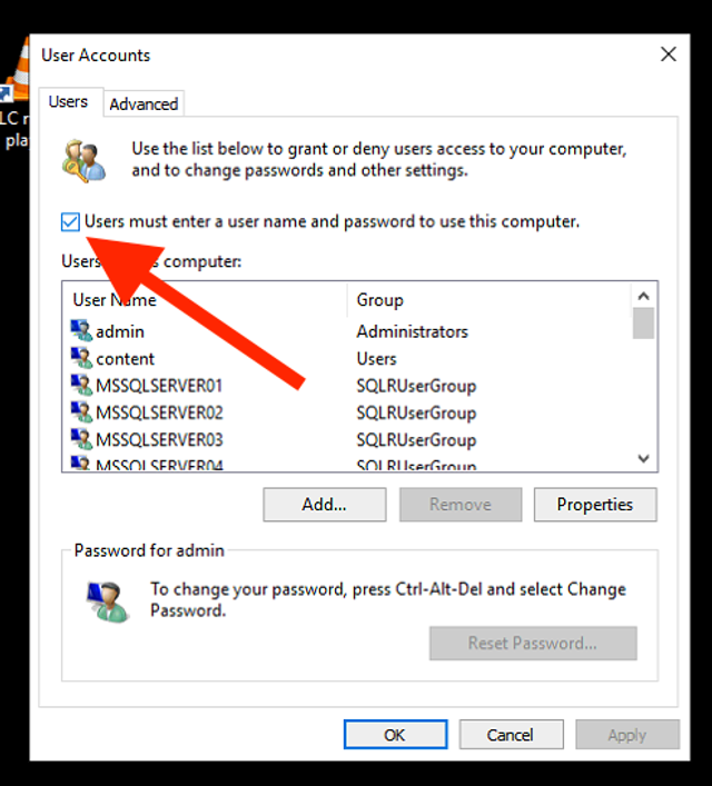 Deselect the Users must enter a user name and password to use this computer check box and click Apply.