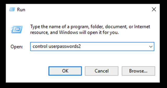 In the Run prompt, enter control userpasswords2 and click OK.
