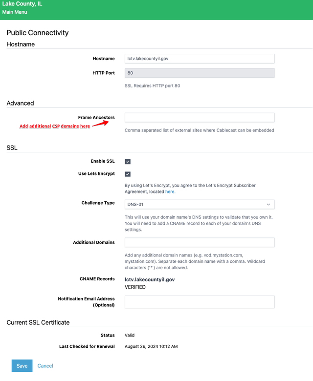 Values ('csp_headers_enabled','True')Additional domains that you want to embed content on cant be allowed from the Cablecast UI after this is enabled.