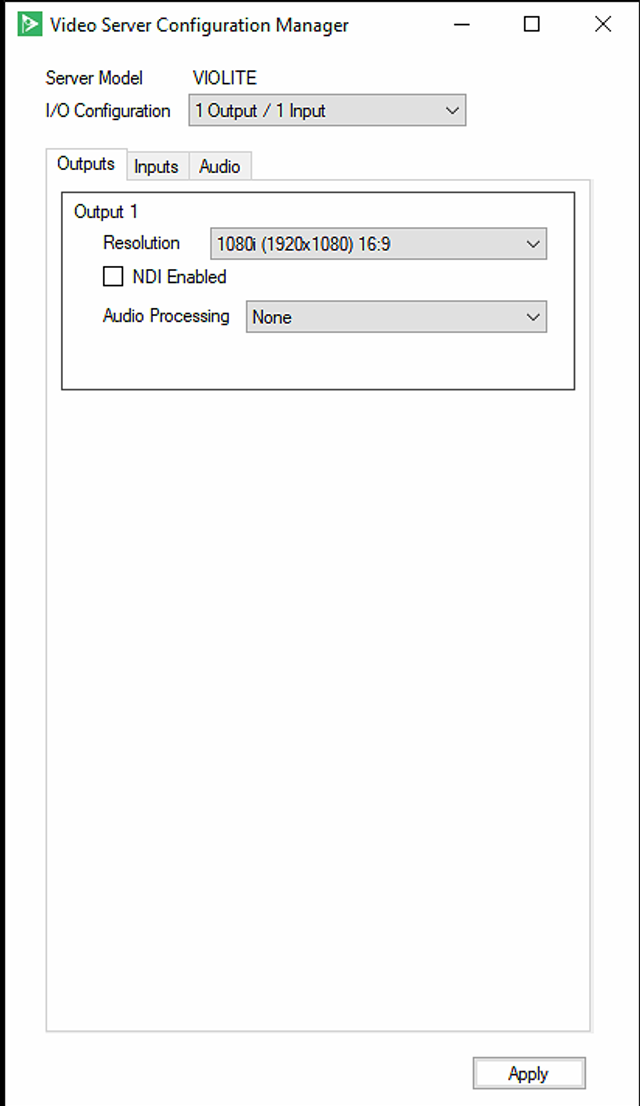 The Configuration Manager is where you are able to set the I/O configuration of the server as well as set the resolution for each output. Depending on the number of Outputs you have set for your server you will have settings for each one.