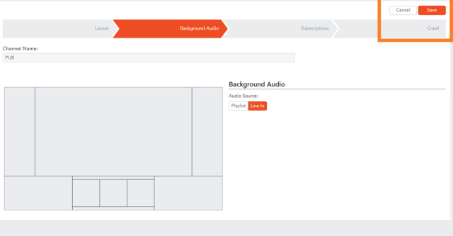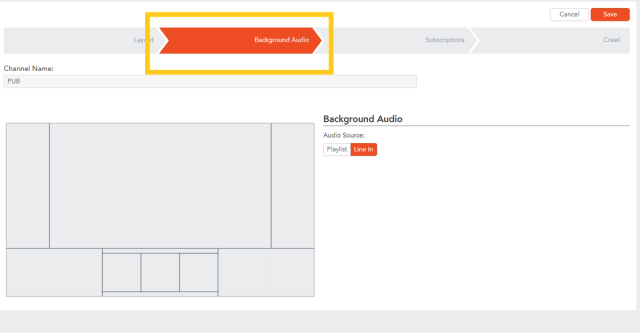 The Line-in option brings in audio from an outside source that is connected to the Audio Input port on the rear of the Carousel CG Player. Line-in audio will not fade out when a video bulletin comes up in your Carousel bulletins, it will play over all bulletins.