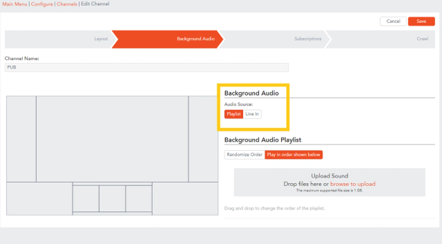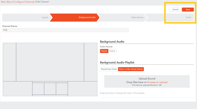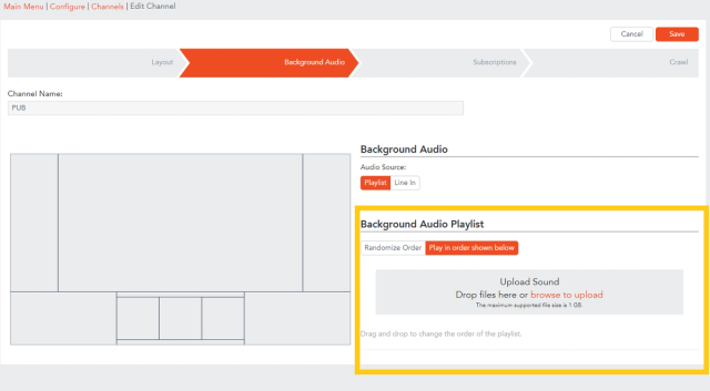A Playlist is made up of mp3 files that you have loaded to your channel to play. The Playlist will play in a loop, and will fade outwhen a video bulletin comes up in your Carousel bulletins.