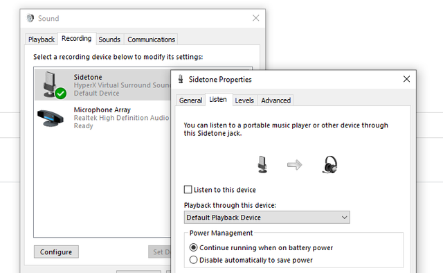 - Select the line in and get to the properties for that source, then click on the "Listen" tab at the top and make sure the "Listen to this device" check box is checked.