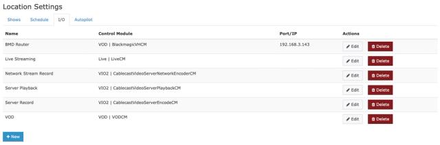 The next thing we will need to do in the setup of the Cablecast software is to configure the Control Modules. Navigate to Settings > Location Settings > I/O Tab > Control Module Sets The control modules tells the server what we are wanting it to do.