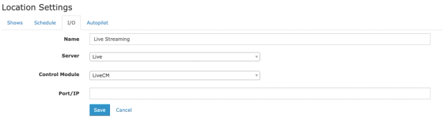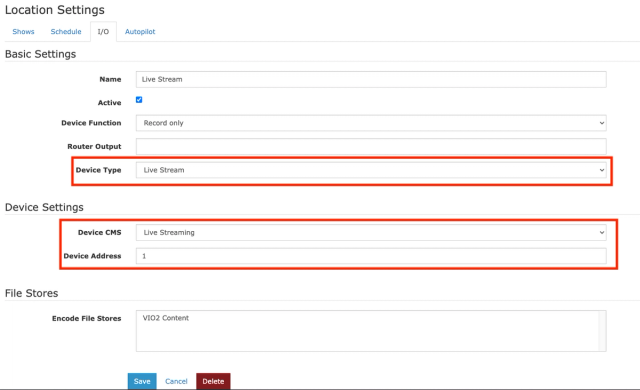 Next, we will set up the Live Stream. Navigate to Settings > Location Settings > I/O Tab > Live Streaming Click on New to create a new stream. Then to set up and edit that stream click on the name of the stream just created.