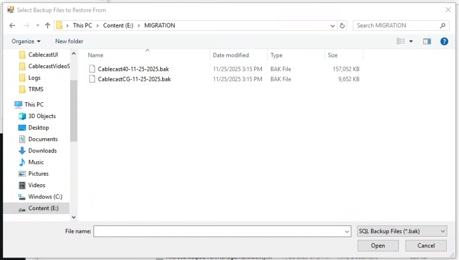 You'll want to copy your MIGRATION folder with all of the files outlined at the beginning of this article over to the new host server before proceeding with restoring the databases on the new host server. If VODContent or playback files are still transferring, that's ok, but SystemAssets and Cablecast CG/Carousel Media will need to be in place on the new system.