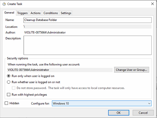 - On the General Tab, name the action Cleanup Database Folder or something that makes sense. Configure for the appropriate server dropdown at the bottom