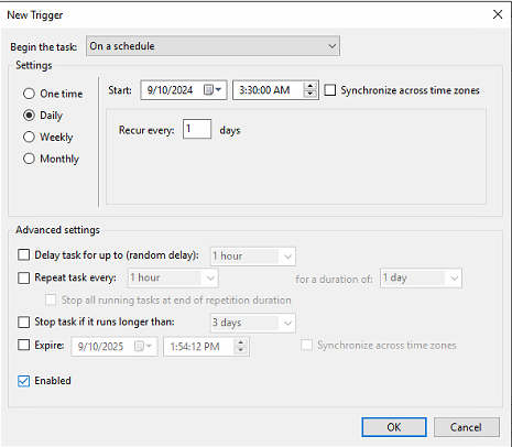- On the Triggers Tab, select New and configure a daily schedule to run shortly after housekeeping ideally.