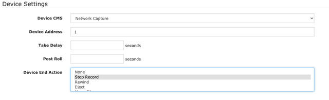 Under the Device Settings, we are going to select the new Control Module that we just created for Device CMS. We do need to set up a Device address and you can set that to 1. You can leave the fields empty for Take Delay and Post Roll. Lastly select Stop Record for your Device End Action.
