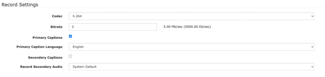 Lastly in the Record Settings, select the Codec that you want to record at and set your Bitrate. We recommend using h.264 and setting your bitrate between 5-10 Mb/sec. You can also select whether you want to enable primary and secondary languages, if you're using Cablecast captions and translations. You can also determine if you want to record a secondary language if you're utilizing MAP with Cablecast. More info on MAP here.