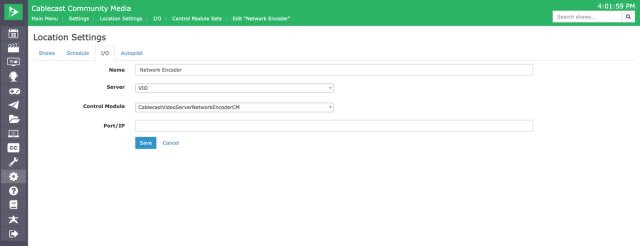 To create a new Control Module, click on New. Name your new Control Module Network Capture, then in the Server drop-down menu, you will want to choose your video server, and in the Control Module drop-down menu, choose the CablecastVideoServerNetworkEncoderCM. Leave the Port/IP field blank. You'll choose the encode location in the Device config for the Network Encoder. Click Save when finished.