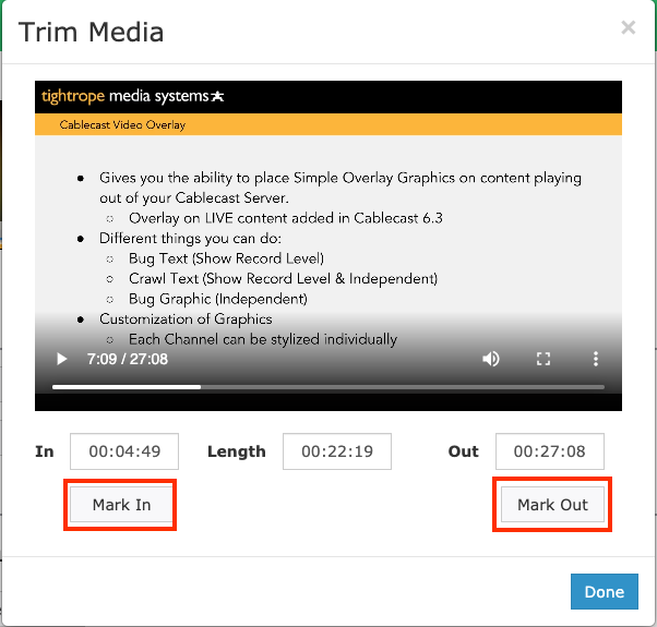 You can play the file within this window and be able to use the play head to mark your in and out marks by clicking on the buttons. Once you have your in and out marked, click Done.
