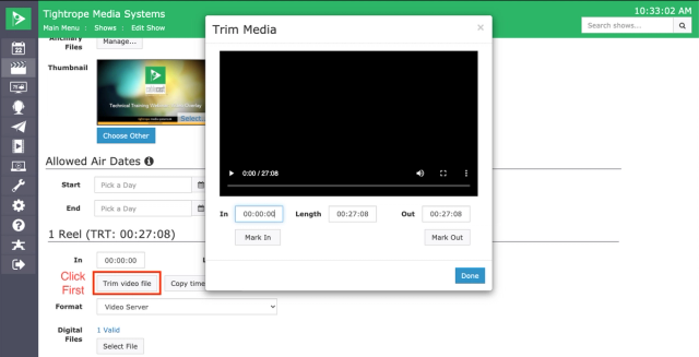 Added in Cablecast 7.2, you now have the ability to PREVIEW and TRIM your files directly within the user interface. This new feature is added within the Show Record when you are linking a file to the record. This is also very helpful when you are recording live events directly to the server.