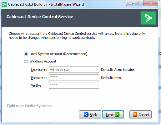 When installing Cablecast where multiple video servers share content ALWAYS run the services under the local administrator account. If you are unsure type "Services" in the search box and open the "Service" panel find the "Cablecast" or "Cablecast Device Control" services. If the login name is "./administrator" make sure you choose the "Windows Account" radio button above. Otherwise just use "Local System."
