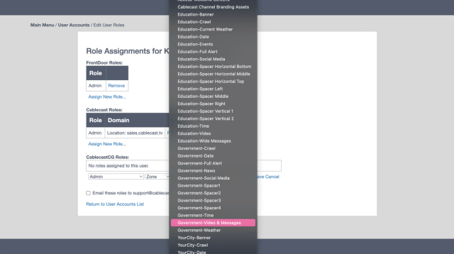 The Role Assignments page is where you’ll assign the Roles you want that user to have within certain areas of the UI. There are three categories here: FrontDoor Roles, Cablecast Roles, and CablecastCG Roles.